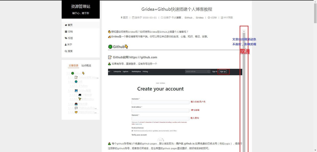 原创Gridea文章页面出现内嵌式滚动条,如何取消? Gridea在发表文章后,文章页面里出现嵌套的滚动条,无用且十分影响美观,找原因,取消它。这是我碰到的一个小问题,现在已经解决,现将原因及解决办法分享出来 。 zyglz 2020-03-03 9030 Gridea